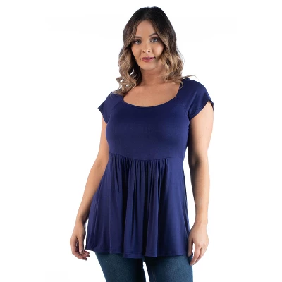 This comfortable and chic plus size babydoll top offers a square neck design with cap sleeves and soft flare hemline. Designed with a pleated empire waistline that flares out below the bust into a flowy shape. Featuring a modern square shaped neckline and cap sleeves. Pair this loose fit womens top with heels and pants for a stylish dressy look or go casual with shorts and flats. Made in the USA from a comfortable stretch material. A simple wardrobe must have, this top is a timeless piece for any occasion. Rayon Spandex Knit.