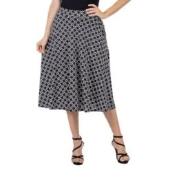Ignite your style with the 24seven Comfort Apparel Black Diamond Print A Line Midi Skirt with Pockets! Designed to make heads turn, this stunning skirt is the epitome of elegance and versatility. The intricate black diamond print adds a touch of glamour, while the A line silhouette gracefully accentuates your curves, creating a flattering and feminine look. With thoughtfully included pockets that allow you to carry your essentials without compromising on style. From casual outings to special occasions, this midi skirt effortlessly takes you from day to night, ensuring you are always fashionably chic. Step into the spotlight and experience the perfect combination of comfort, confidence, and trend setting style with the 24seven Comfort Apparel Black Diamond Print A Line Midi Skirt with Pockets