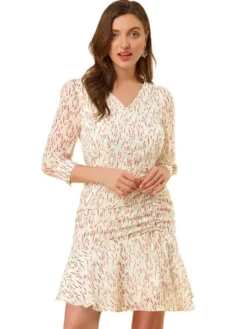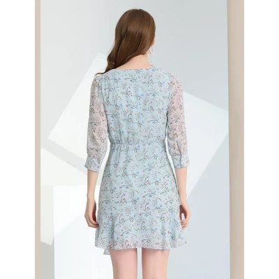Twist the night away in this floral ruched dress to a romantic, eye-catching style. Ruffles and drawstring ruched design bring sweet style to this 3/4 sleeve dress in chiffon with an eye-catching print. Sweet and vintage, this floral chiffon dress is styled with side ruching, elastic back, and button decor front.