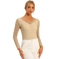 Made of lightweight semi-sheer fabric in a fitting silhouette, this elegant lace blouse from Allegra K is designed with a lace trim and full sleeves, which is an effortless option for weddings, night outings, or parties. A flattering deep V-neckline and long feminine sleeves, show your enchantment better. A scalloped lace trim and lace panel add a romantic feeling to this stretchy blouse, especially for teens, girls, or ladies.