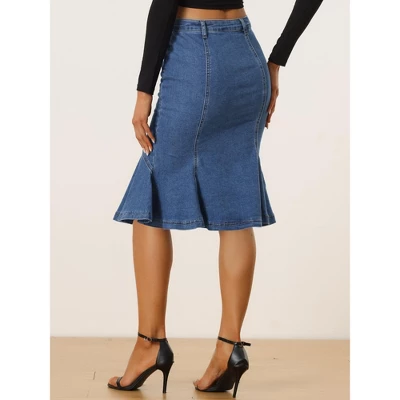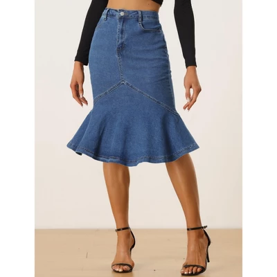 Allegra K Fishtail Denim Skirt for Women’s High Waist Bodycon Jean Ruffles Skirt.Midi length falls below the knee, making it versatile for both casual and dressy occasions.Fishtail silhouette flatters all body types and adds a feminine touch to any outfit, will quickly become one of your favorites.Perfect with cropped tops, jackets, coats, boots, sandals, and high heels for a stylish feminine look.