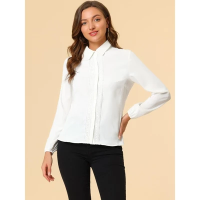 - Turn Down Collar, Button Up, Lace Decor, Long Sleeve, Elastic Cuff Basic Shirt