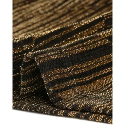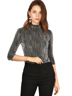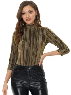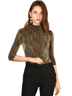 Add a glimmer of fashion to your everyday or night-out look in this metallic tops. Shimmering metallic threads enliven this fashion top styled with a mock neckline and 3/4 sleeve. Make any look instantly party-vibe ready with this mock-neck tops in shimmering metallic stripes. Wear it with wide-leg trousers or style it with leather leggings and heels for the evening.
