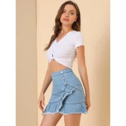 A good choice for your wardrobe, denim skirts will always be on-trend. The combination of a denim fabric and a ruffle hem to enhances an air of laid-back casual glamour of this feminine skirt. This is a summer skirt with an irregular hem at the front, mini length, and button decor. Pair it with stylish T-shirts and vintage high heels for a charming inspired look. This regular fit is perfect for a day-to-night look during spring and summer days.