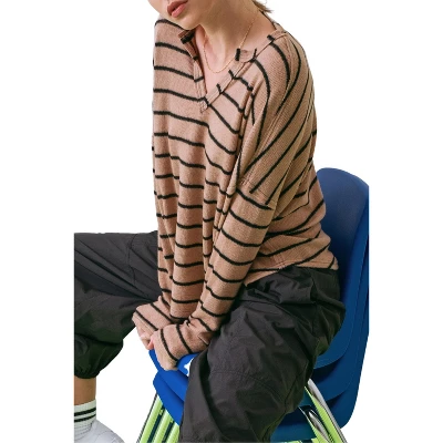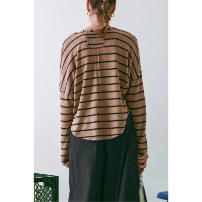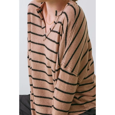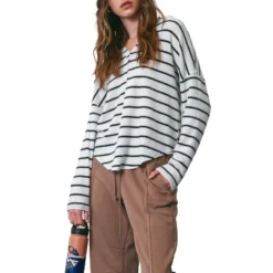Elevate your fashion game with this must-have piece that seamlessly combines chic style and effortless elegance. Introducing our stylish and versatile August Sky Women’s Stripe Split Neckline Pullover Top, a true wardrobe essential. This contemporary design effortlessly blends comfort and sophistication. The relaxed fit features dropped shoulders and long sleeves, providing a laid-back yet polished look. The raw edge details add a touch of edginess, while the curved hemline offers a flattering silhouette. Elevate your fashion game with this must-have piece that seamlessly combines chic style and effortless elegance. The stripe pattern adds a trendy element, making it a versatile choice for both casual and semi-formal occasions.
