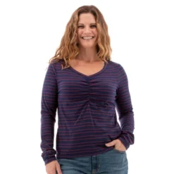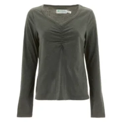 Cotton pairs with eco-conscious recycled polyester to craft a feminine top worthy of a spot in your wardrobe. The Gabrielle Top is a basic top that has a fun twist and an exceptional fit. This top is not only relaxed and comfortable, but it is also flattering because of an open V-neck and ruching in the front. The luscious single jersey that crafts this long sleeve accentuates the fit, allowing for a great balance of structure and stretch. The Gabrielle Top is your canvas – dress it up and accessorize it for any occasion!