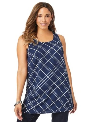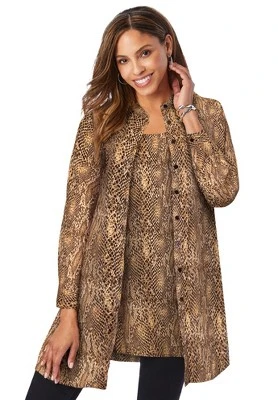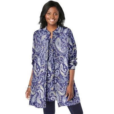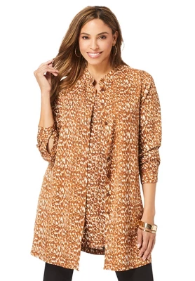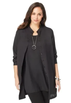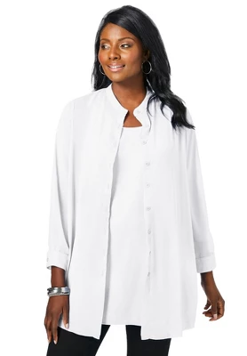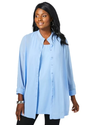 Our new longer mega tunic with high side slits for easy styling. Wear buttoned or open over the matching sleeveless georgette mega tunic shell. Mandarin collar, banded cuff. Polished pearlized buttons.