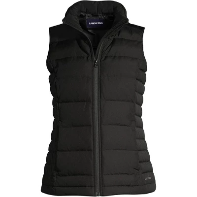 This Lands’ End Women’s Winter Down Puffer Vest may seem standard but trust us this is no basic sleeveless puffy coat. For one thing it’s lightweight not heavy but still delivers a substantial punch of warmth. Made with a 100% polyester exterior shell and a 600 Down interior it’s guaranteed to keep you warm wherever it has you covered. Plus the water resistant finish repels precipitation when you get caught in inclement weather. With a high collar neck for added warmth mid thigh length longer coverage in back and a dual welt pockets with fleece tricot lining you’ll be ready when the warm winds of summer turn into those cool brisk days of fall. Plus it’s packable for travel so you can throw it in a suitcase or the backseat of your car for those impromptu weekend trips to see the fall leaves change color. How romantic. Flattering stitch lines throughout give this ladies puffer vest a flattering feminine figure. Offered in a variety of solid colors and fun prints like brown leopard olive green palm blue tie dye peach ivory black and traditional plaid. Lands’ End coats are sized for layering so order according to your true size fit.