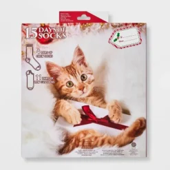 Never run out of socks to wear during the festive season with these Holiday Cats 15 Days of Socks Advent Calendar Crew Socks. Crafted from a soft fabric with a hint of spandex for stretchy comfort, these holiday cats socks include eleven pairs of low-cut socks and four pairs of crew socks to add assorted variety to your festive sock collection. Plus, banded cuffs maintain a secure fit to keep them in place while you go about your day. Showcasing holiday-themed prints of cats wearing hats, wrapped in string light, holding presents and more, this sock advent calendar will add fun, festive touches to your sock drawer.