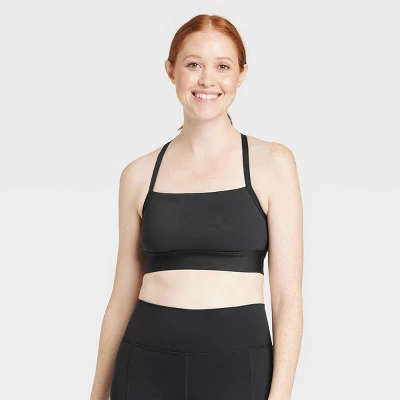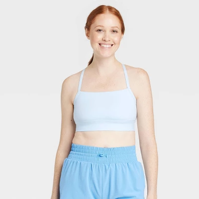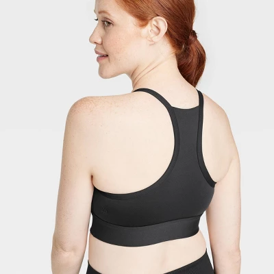 Halter midline sports bra in a solid hue lends style and function to lower-intensity workouts. Constructed from opaque moisture-wicking, quick-dry fabric with mesh liner for comfortable wear. Removable padding adds a customizable fit that offers light support, and a racer back lends sporty style.