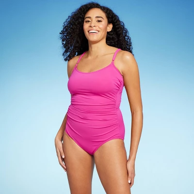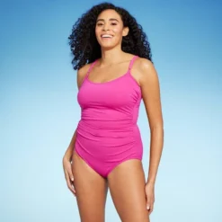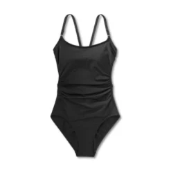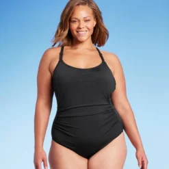 The Shirred Front Keyhole Back Full Coverage One-Piece Swimsuit with Tummy Control from Kona Sol™ proves that simple doesn’t have to be boring. This one-piece swimsuit has a full coverage design that provides full torso and seat coverage, along with sewn-in cups for added bust coverage. A scoop neckline gives the swimsuit a classic look that’s balanced out by the striking look of straps that come to a V and create a large keyhole in the back. A tummy control panel helps to smooth and slim, and the solid black color keeps the suit simple yet chic — just throw on a pair of palazzo pants to take the swimsuit from the water to the day’s next outing.