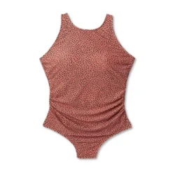 Elevate your swim style with this High Neck Ruched One-Piece Swimsuit from Kona Sol™. This one-piece swimsuit offers medium coverage and a features a black spot pattern on a brown backdrop. Made from stretchy fabric for ease of movement, it’s detailed with a simple high round neck and a ruched textured front for a touch of flattering style. The crisscross back with adjustable straps makes it easy to find just the right fit, and the sewn-in cups offer shaping and comfortable coverage.